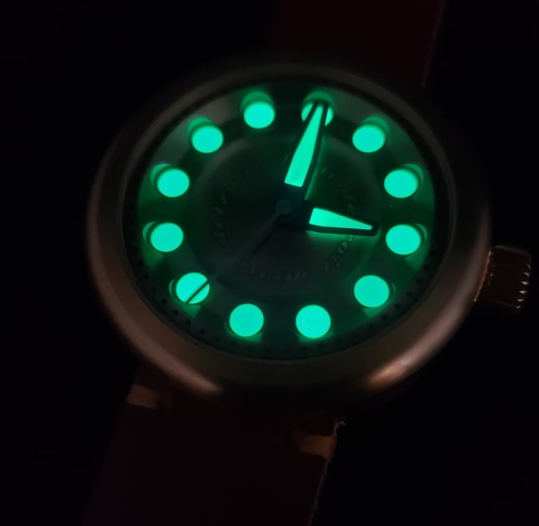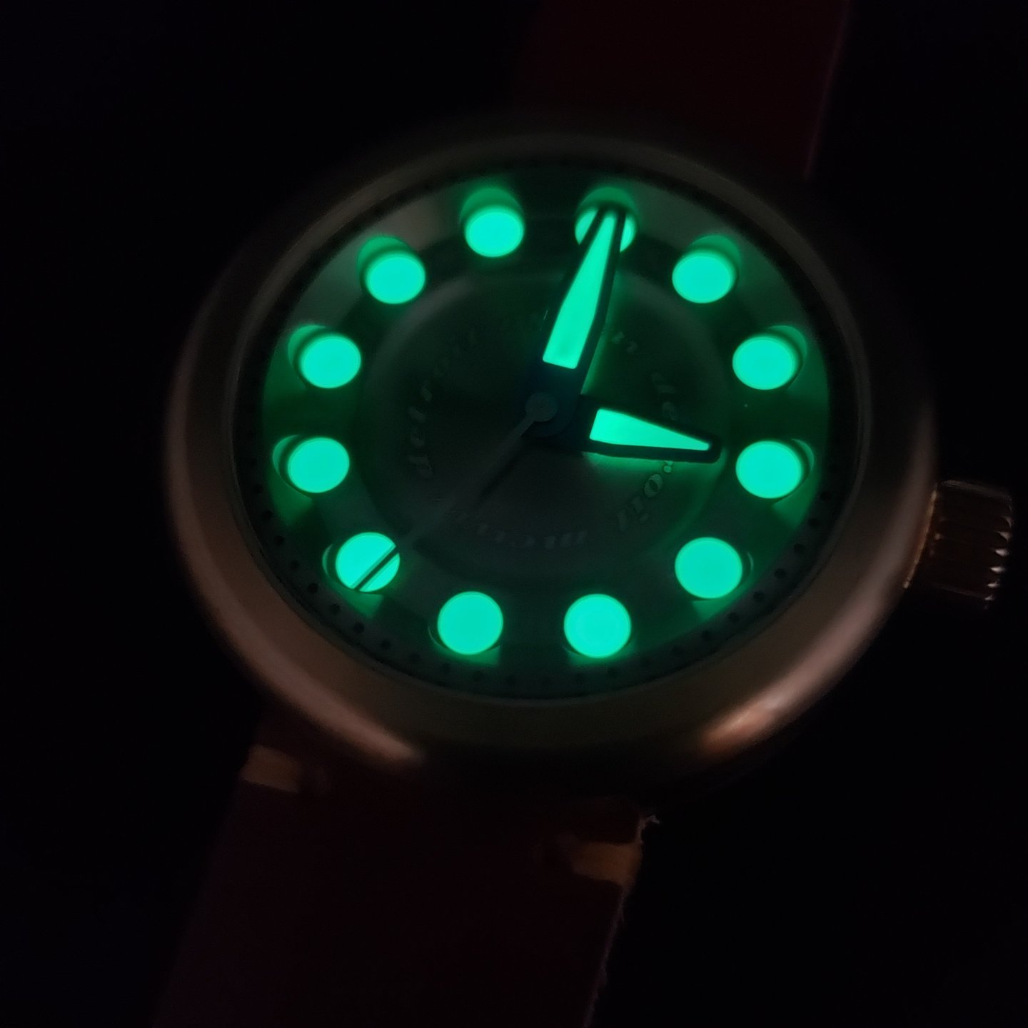 Hands: Handmade by yours truly, they are also grade 5 titanium, with as much lume as I can fit into a 0.15mm thick space. (which is to say not as much as the dial.)