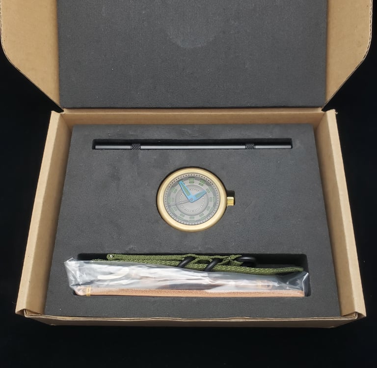Packaging: A badass cardboard box with soft foam filler. Inside is your watch, the 2 straps, and a strap tool. Sweet!