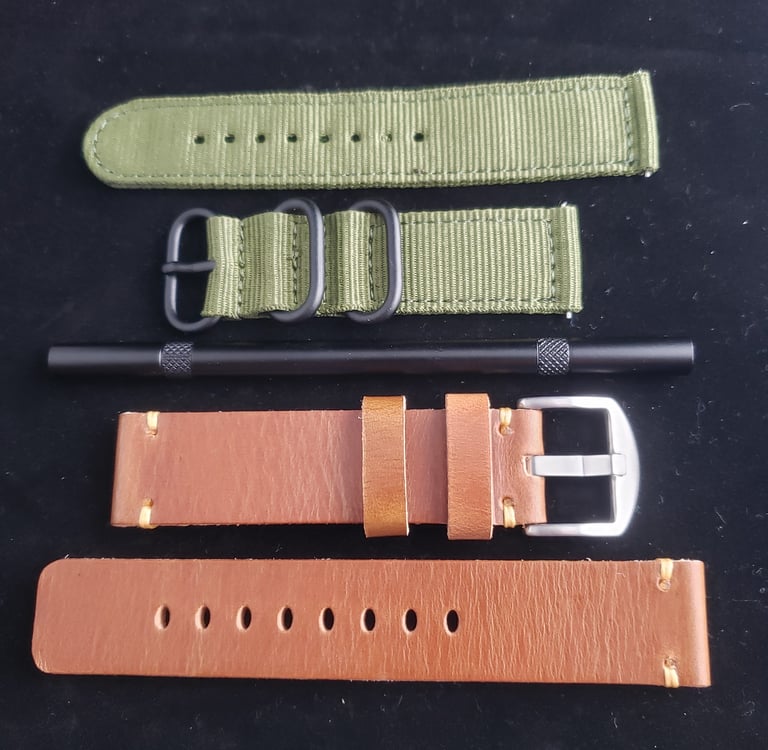 Straps: Width is 22mm. There is one green 2-piece fabric strap and a 4.00mm thick brown leather strap with a stainless steel buckle.